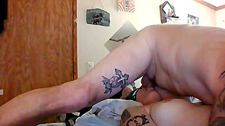 Large titted aged in a satin blouse and erotic nylons is riding a younger studs hard shlong